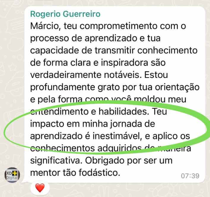 Quanto a Escola de Vendas Digitais, você literalmente nunca viu nada igual. O propósito do Marcio está totalmente conectado a tudo, e ele é incansável quando falamos em resultados dos seus alunos