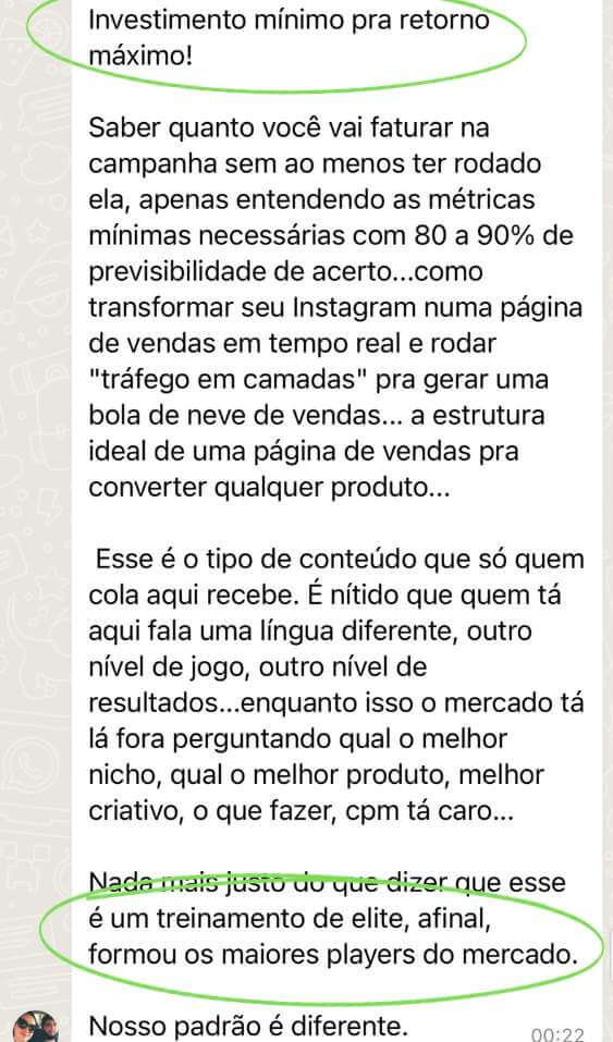Você passará por treinamentos de tráfego mais avançados, contingência, criação de páginas, tráfego para WhatsApp e Instagram.