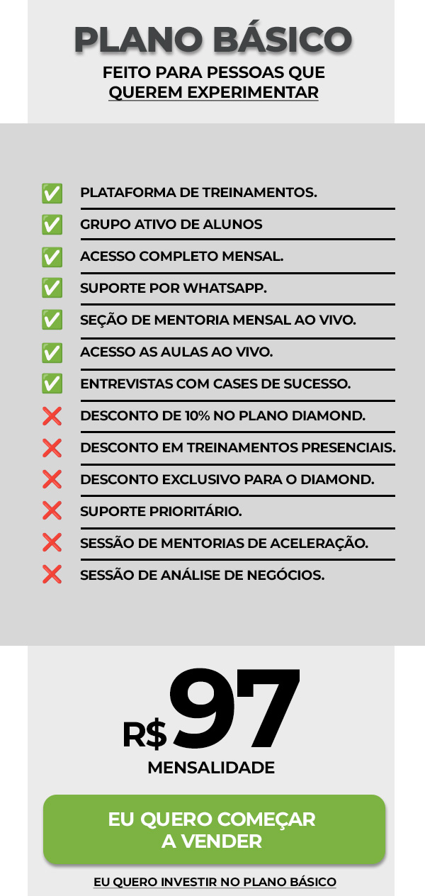 Você poderá começar sem absolutamente nada. Inclusive com um investimento absolutamente baixo no Plano Básico e depois você pode migrar para o Plano Completo.